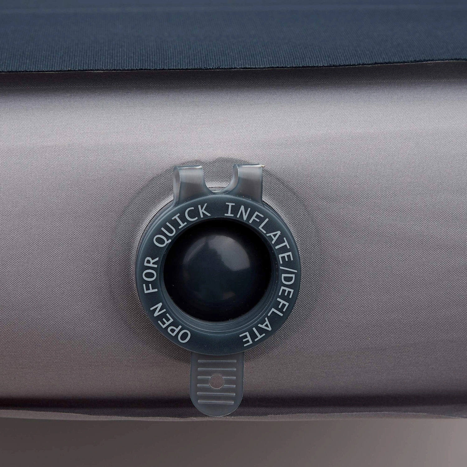 Die Matratze ist selbstaufblasend. Durch die beiden großen Ventile kann schnell Luft hinein- und herausgelassen werden. Wer eine festere Liegefläche bevorzugt, kann mit der beiliegenden Handpumpe Luft nachpumpen und die härte dadurch individuell bestimmen. Die Pumpe kann während des Schlafens am Ventil angeschlossen bleiben. So besteht die Möglichkeit während der Nacht Luft nachzupumpen.