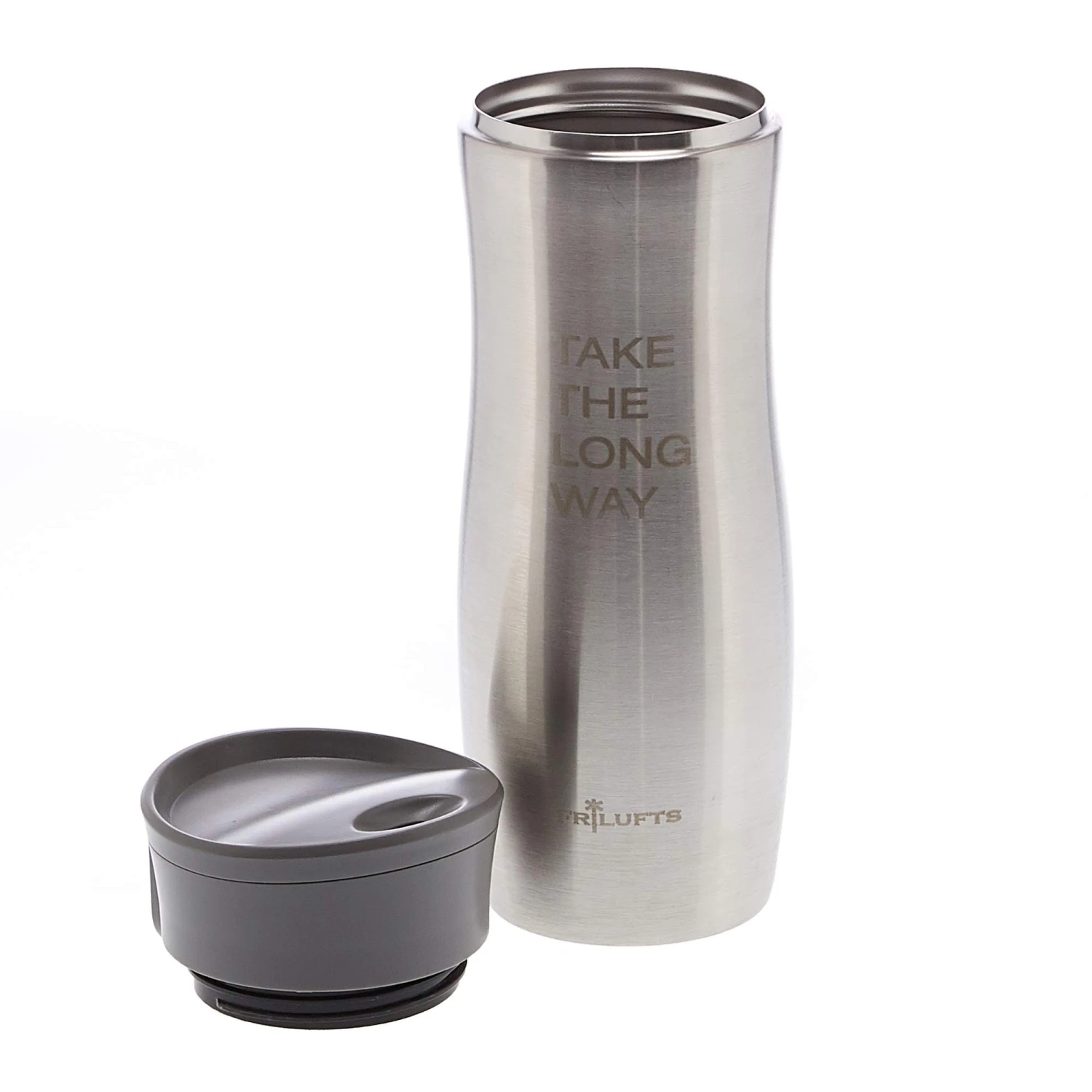 Der Becher besitzt ein innenliegendes Gewinde, weshalb du auch ohne Deckel gut aus ihm trinken kannst, da die Lippen keine störenden Windungen berühren. Ist der Deckel aufgeschraubt, bleibt alles da wo es soll – im Becher. Die Dichtung am Mundstück hält zuverlässig dicht, erlaubt aber auch einen großen Schluck aus dem Becher, wenn die Entriegelungstaste auf der Rückseite gedrückt wird.