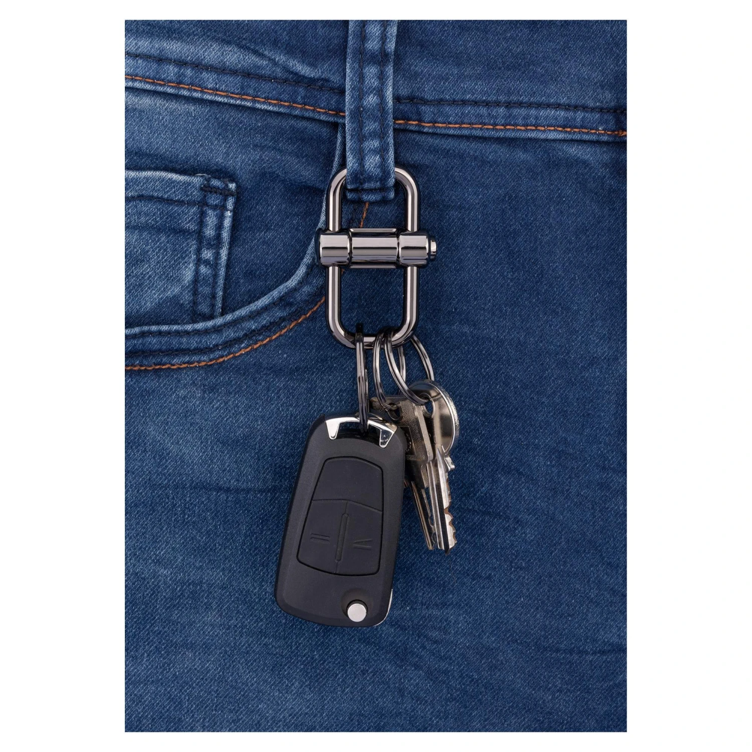 Mit diesem Schlüsselanhänger hast du nur die Schlüssel bei dir, die du auch wirklich benötigst. Per Knopfdruck (seitlich) lässt sich die Verriegelung lösen und der Bolzen zur Seite schieben.