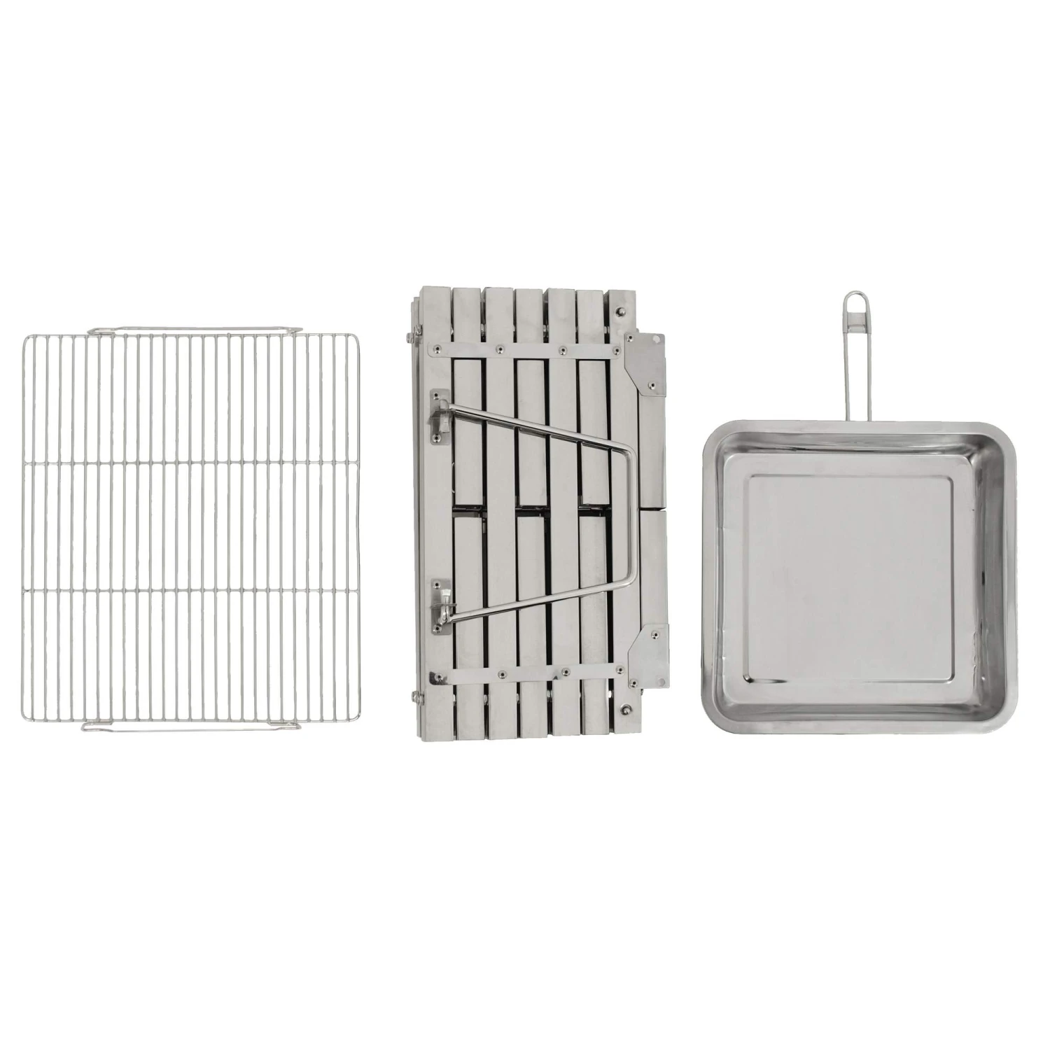 Das robuste Gestell aus Edelstahl kann leicht ein- und ausgefaltet werden, indem an den seitlichen Henkeln gezogen wird. Anschließend nur noch die Beine ausklappen, Ascheblech einschieben und Rost auflegen und schon kann das Grillvergnügen beginnen. Für eine optimale Temperatur ist die Kohleschale in zwei Höhen positionierbar. Die unterste Einstellung ist ideal für die Funktion als Feuerschale oder zum Grillstart geeignet. Wird das Blech oben eingesetzt, kannst du die Restglut zum Grillen verwenden.