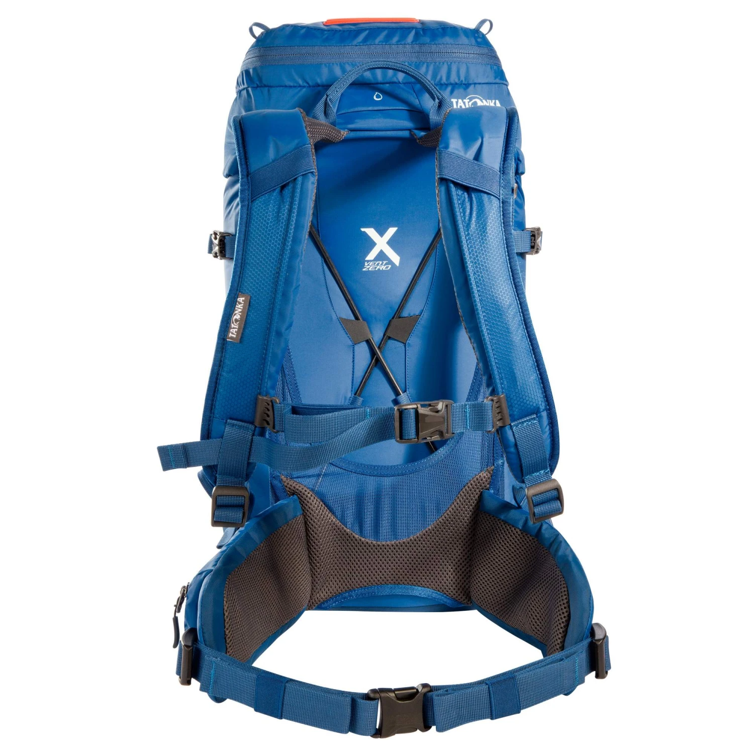 Bei dem X Vent Zero-Tragesystem entscheidest du selbst, wie viel Belüftung und Rückenkontakt du gerade brauchst. Möglich wird das durch die Polypropylenplatte mit zwei Fiberglasstäben und die Gurtbänder, mit denen du die Spannung regulierst. Willst du bei schweißtreibenden Passagen viel Belüftung, stellst du eine hohe Spannung ein. Willst du den Tagesrucksack nah am Rücken tragen, beispielsweise wenn er voll bepackt ist, verringerst du die Spannung und damit den Abstand.